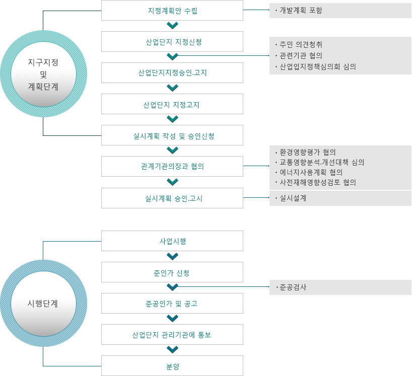 - 산업단지란 산업의 적정한 지방 분산을 촉진하고 지역경제의 활성화를 위하여 산업시설용지 및 이와 관련된 교육·연구·업무·지원·정보처리·유통시설 및 이들 시설의 기능 향상을 위한 주거·문화·환경·공원녹지·의료·관광·체육·복지시설 등을 집단적으로 설치하기 위하여 포괄적 계획에 따라 지정·개발하는 사업입니다.