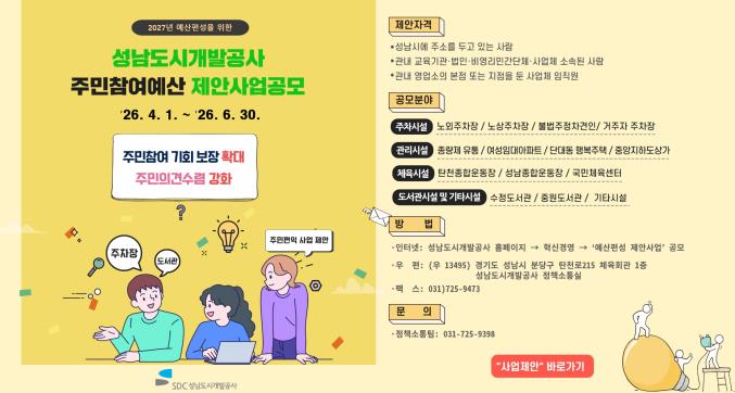 성남시 택시공영차고지 제1영업소 및 제1주차장 공유재산 사용허가 입찰 재공고2025.12.22 『성남 바이오헬스 첨단 클러스터 조성사업 조사설계용역』책임기술인능력평가 결과 공개2025.12.02 『성남 바이오헬스 첨단 클러스터 조성사업 조사설계용역』 사업수행능력평가(업무중복도) 자료공개2025.11.19 주차요금 체납자 예금압류 공시송달 공고(2025-8차)2025.09.08 25. 4월 주차요금 미납차량 공시송달 공고(압류예정)2025.09.05 고시공고 더보기